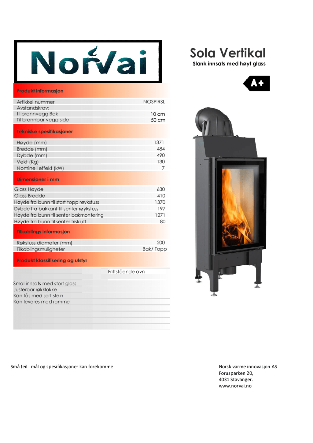 Sola er en peis som skiller seg ut fra de tradisjonelle innsatsene. Denne modellen tilbyr et høyt format glass, hvor flammene skinner i sentrum. Peisen er nett og plassbesparende. Dersom du ønsker peis, men har liten plass – da kan Norvai Sola være løsningen på problemet.