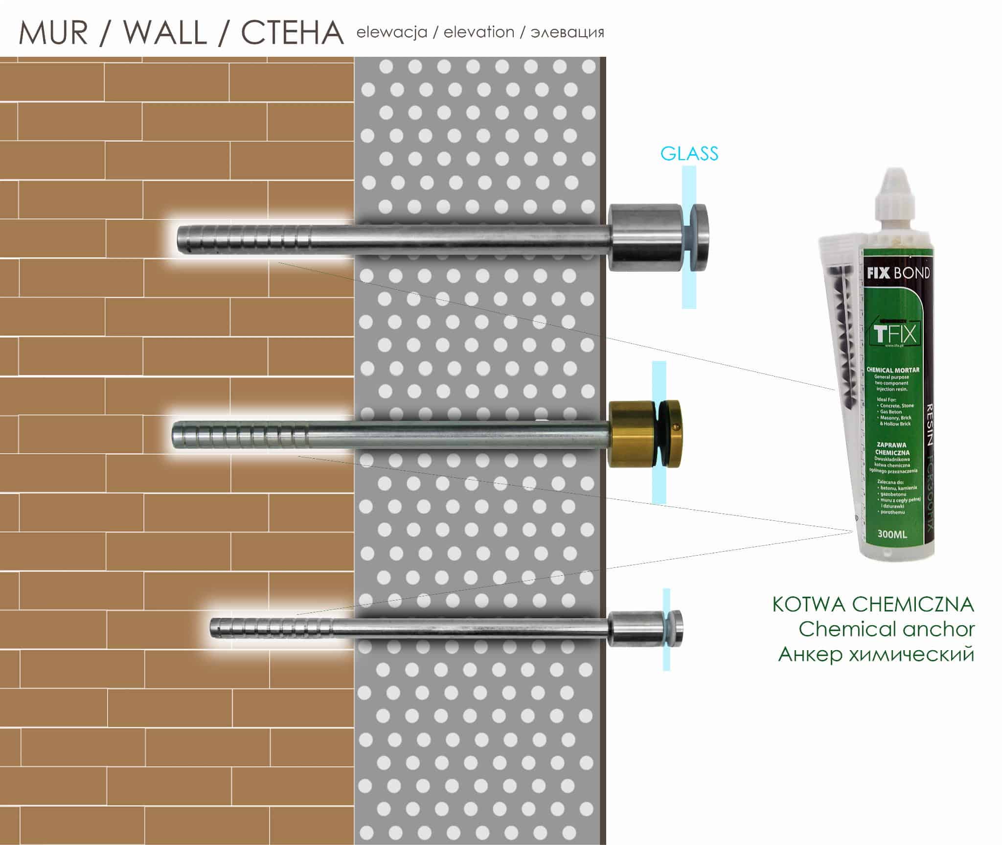 M8 innvendig gjengeside etter liming inn i vegg skal være i flukt med fasaden. Avstandshylsen kobles til den med DIN 913 M8