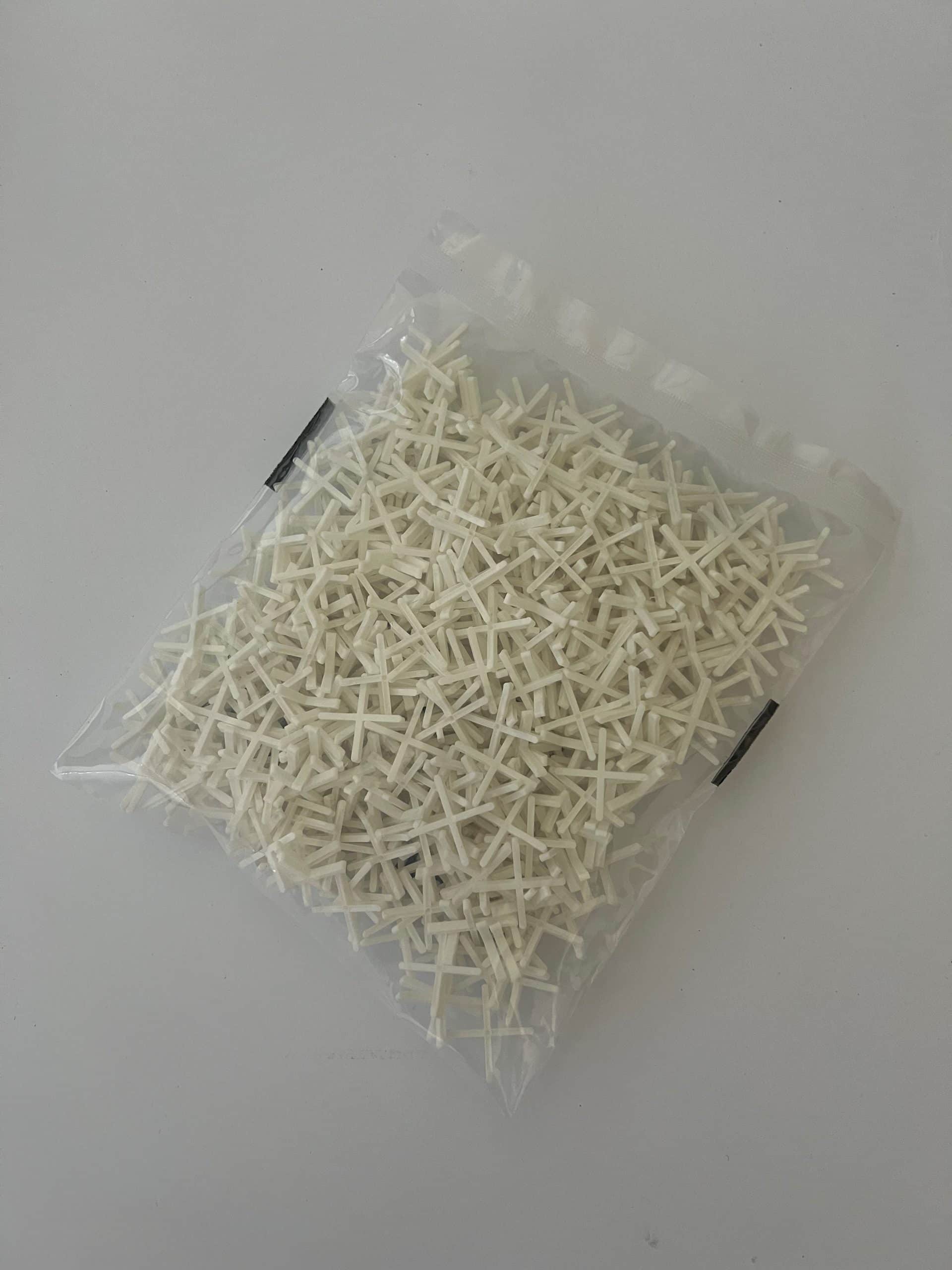 Fliskryss 3 mm. Produsert i plast for å gi jevn fugebredde ved flislegging. Kan bli sittende ettersom de kan dekkes av fugene. 500 stk. pr. forpakning.
